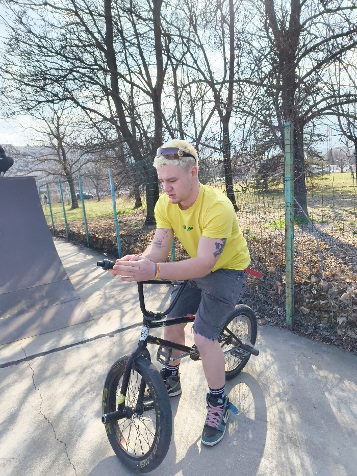 A male individual with short blond hair and sunglasses resting on his head is seated on a black BMX bicycle on a concrete surface. He wears a yellow t-shirt with text, distressed grey shorts, and multi-colored high-top sneakers with striped socks. A yellow and blue bracelet, alongside a dark bracelet, adorns his right wrist, and tattoos are visible on both forearms. His hands are positioned on the BMX handlebars. To the left of the frame, a dark grey skate ramp is visible. The scene is outdoors, characterized by bare deciduous trees, a metal fence separating a grassy area, and faint urban structures in the distant background, under clear, bright daylight. This scene is consistent with a public skatepark environment in the city of Sofia, Bulgaria.