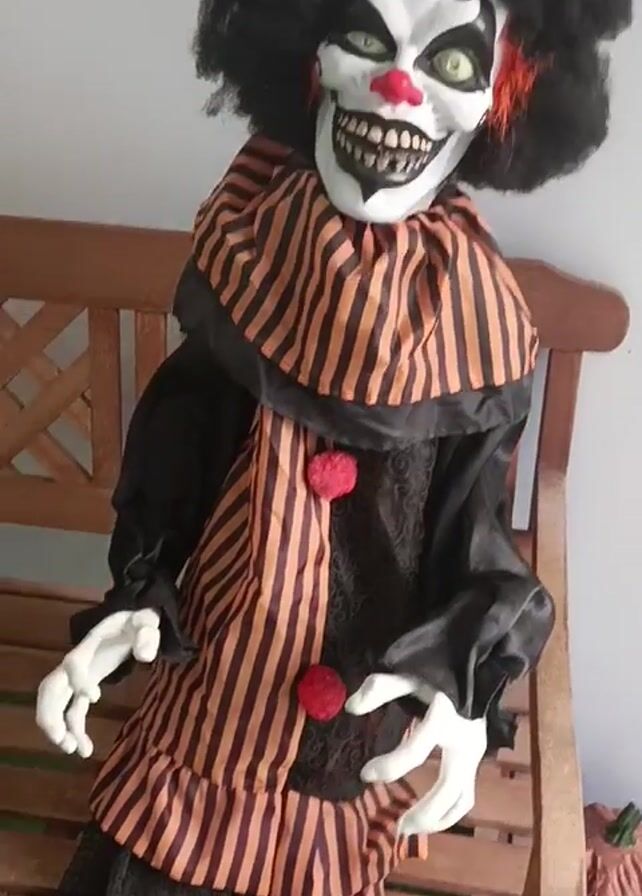 - "scary clown doll on a wooden bench, then a scary butler doll holding a silver tray with papers on a wooden bench, then the view looking through a glass door into a room with wood floors and a receptionist inside, where there is a Push To Ring bell" by FM-BdCXB3, licensed under CC BY 4.0