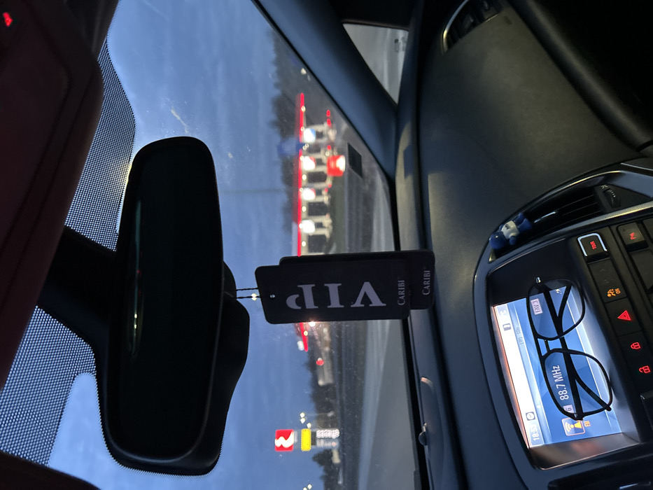 The scene depicts the interior of a vehicle looking forward through the windshield towards an external environment at dusk. **Location:** Baliovtsi, Bulgaria. **Environment:** The exterior view shows a multi-lane road leading towards a distant illuminated gas station. The gas station features a prominent canopy with red overhead lighting and multiple fuel pumps. To the left of the gas station, a tall pole bears a red and yellow sign. The sky is overcast with a blue-grey hue, indicative of twilight conditions. Sparse trees are visible on the horizon. **Vehicle Interior:** The perspective is from within the driver's or front passenger's seat. A black rearview mirror is centrally positioned at the top of the frame. Hanging from the rearview mirror are two black rectangular air freshener tags, both displaying "VIP" vertically in white capital letters and "CARIBI" in smaller white text below. The dashboard, predominantly dark grey, is visible in the lower half of the frame. An illuminated infotainment system screen displays "18:53" and "88.7 MHz". A pair of black-framed eyeglasses rests horizontally on this screen. Below the screen are various control buttons, including a red hazard warning button. A vehicle air vent is visible to the right of the infotainment system, with a small blue and white character figure attached to it. No individuals are visible.