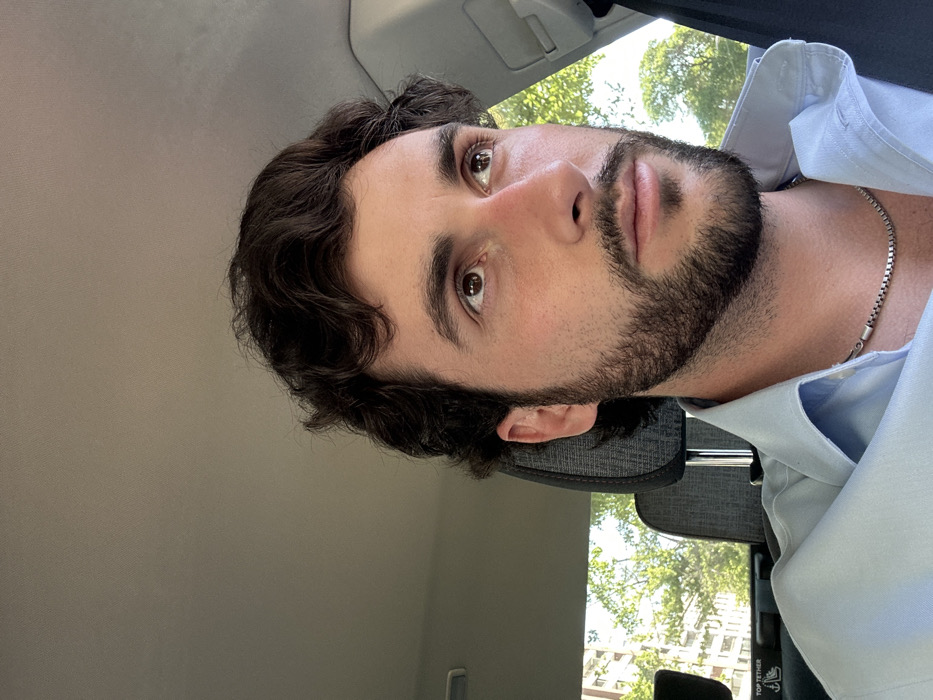 A male individual is depicted in a close-up, seated within a vehicle in Providencia, Chile. He possesses dark, wavy hair, a full beard, and brown eyes fixed upward and to the right. Attire consists of a light blue collared shirt, unbuttoned, and a silver-colored box-link necklace. The vehicle's light-colored headliner is visible above. A dark grey fabric headrest is positioned behind him, and a 'TOP TETHER' label is affixed to the seat back. Exterior views through vehicle windows reveal green tree foliage, a portion of a light-colored multi-story building on the left, and a bright blue sky on the right.