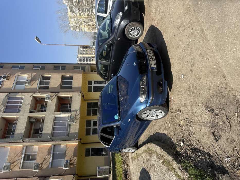 The image displays an outdoor scene in Vidin, Bulgaria, featuring several parked vehicles on an unpaved lot in front of a multi-story residential building. In the immediate foreground, a dark metallic blue BMW E46 sedan is parked on a dirt and gravel surface, oriented slightly towards the right side of the frame. Its front license plate, "E 2440 MX," is clearly visible, confirming Vidin registration. A light blue, spherical object hangs from the vehicle's rearview mirror. Behind and to the right of the BMW, a black Nissan Micra (K12 generation) hatchback is parked, facing left. A small portion of a white vehicle is visible behind the Nissan. The parking area is unpaved, composed of packed dirt, gravel, and sparse, dry grass with some scattered leaf debris on the left, adjacent to a low, uneven dirt embankment. Directly behind the parked cars stands a multi-story building. Its ground floor exhibits a yellow facade, while the upper floors are beige. This building features multiple windows, balconies, and numerous external air conditioning units mounted on its exterior. In the background, under a clear blue sky, additional multi-story apartment buildings are visible. A tall, slender street light pole is positioned on the right side of the frame, between the foreground building and the more distant structures. The scene is illuminated by bright sunlight, casting shadows towards the right.