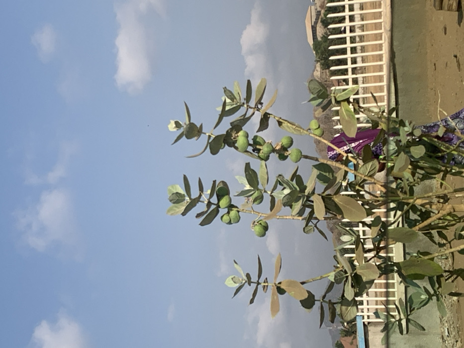 The image portrays an outdoor scene in Abobo, Nigeria, under a clear blue sky with sparse white clouds. In the foreground, a prominent *Calotropis procera* (Sodom apple) plant stands, featuring multiple thick stems, light green-grey ovate leaves, and numerous spherical light green fruits. The immediate ground is earthen, appearing reddish-brown. Partially obscured behind the plant, a person is visible from the upper torso downwards, draped in purple fabric with a patterned design, facing away from the viewer. A white vertical slat fence extends horizontally across the midground. In the background, a light blue building with white trim is visible to the left, and another building with a light brown roof is situated on a distant hill to the right. Elevated terrain is discernible in the far background.