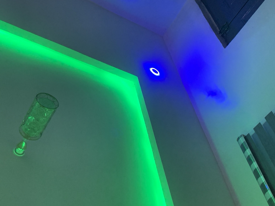 This image depicts an interior view of a room, specifically a ceiling and upper wall sections, located in Nabatum, Nigeria. The ceiling features a multi-tiered design with integrated lighting. A green LED strip light illuminates a ceiling cove along the top and left side of the frame, casting a green hue. A single, clear or green-tinted glass pendant light fixture, with a textured surface, hangs from the ceiling near the upper-left. Further to the right, a small, circular light fixture emits a distinct blue glow. The upper wall area on the right is bathed in blue light. In the lower-left quadrant, a portion of a striped, dark-colored window blind is visible. A dark, rectangular structure, possibly a closed door or window frame, is partially observed in the lower-right corner. No individuals or active interactions are present in the scene.