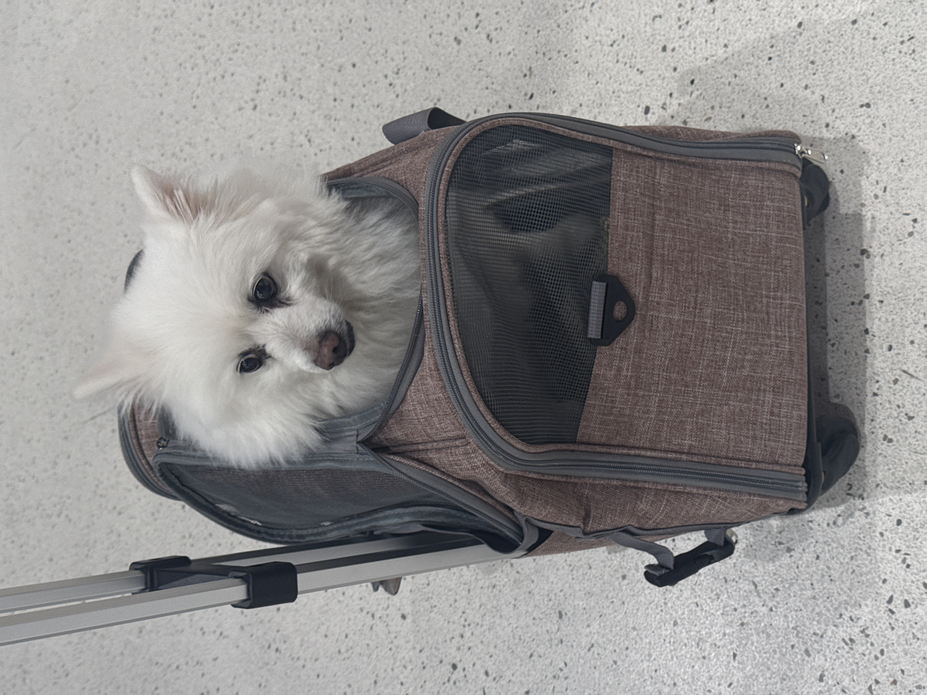 In the city of Segrate, Italy, a white, fluffy, spitz-type dog with dark eyes and a dark nose is observed inside a brown fabric pet carrier. The dog's head and upper body are visible through an open top or side panel of the carrier, facing slightly right of the viewer's perspective. The carrier itself is part of a wheeled luggage system, indicated by the extended silver telescoping handle visible on the left side. The carrier features dark mesh panels and dark grey trim and zippers. The object rests on a light grey, speckled flooring surface. No other individuals or objects are discernible in the immediate vicinity.