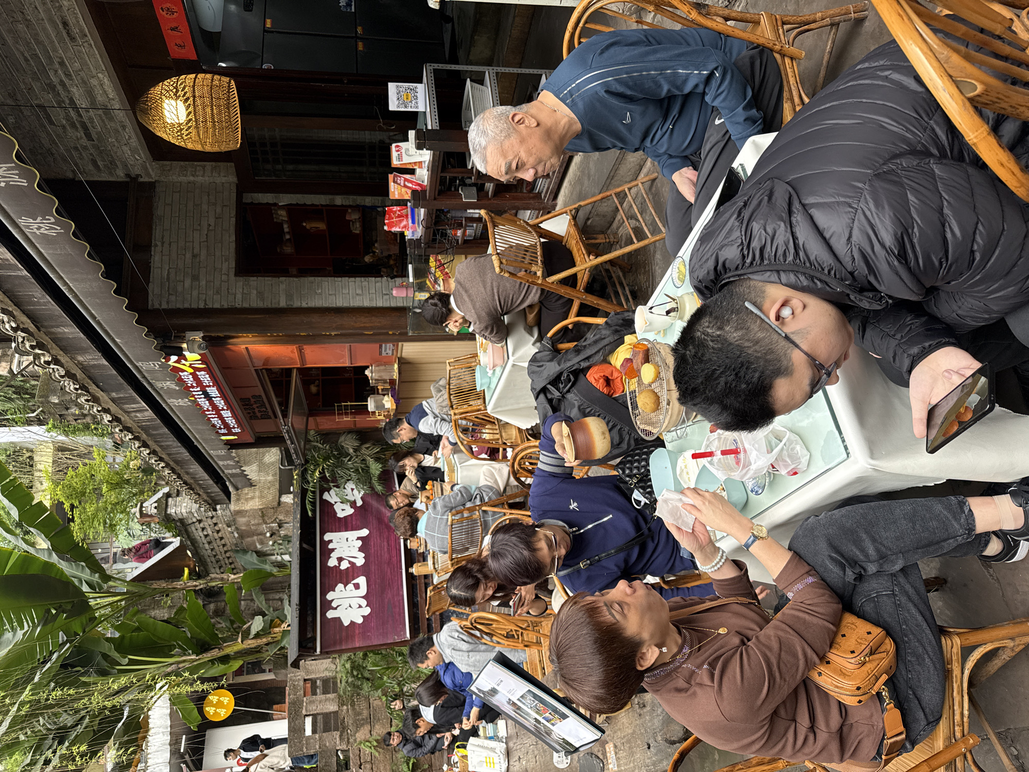 The image depicts a bustling outdoor dining area located in Nan'an District, China. Multiple groups of individuals, predominantly adults, are seated at tables equipped with light-colored tablecloths and light-brown bamboo-style chairs. In the immediate foreground, a woman wearing a brown long-sleeved top, black jeans, an MCM crossbody bag, and a pearl bracelet is holding a white napkin, turning her head to her left. To her right, a man in a black puffer jacket and glasses is focused on a smartphone held in his hands, with a white earbud visible in his right ear. Adjacent to him, an older man with short grey hair, dressed in a blue athletic long-sleeved shirt with a visible Nike logo, sits calmly, observing the area to his left. At a nearby table in the mid-ground, a woman in a blue quarter-zip top and glasses holds a brown ceramic cup with both hands, looking downwards. Other patrons are visible throughout the scene, engaged in dining, conversation, and smartphone use. On the foreground table, a small black barbecue grill holds several food items. The background features multi-level traditional Chinese architecture with grey brickwork, dark tiled roofs, and brown awnings extending over storefronts. A prominent maroon sign with white Chinese characters "桃洲哼" (Tao Zhou Heng) is affixed to a building. Lush green vegetation, including large banana leaves and trailing vines, is interspersed throughout the environment. A distinct woven rattan pendant lamp hangs from an awning overhead. A security camera is mounted under an awning near one of the shops.