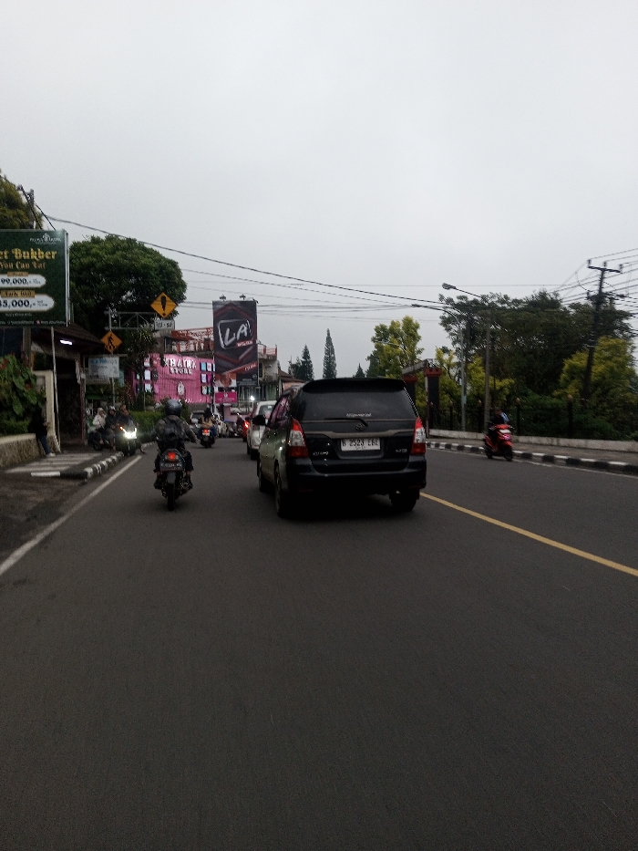 The image displays a daytime street scene under an overcast sky. An asphalt road, delineated by a solid white line on the left edge and a solid yellow line on the right, carries vehicular traffic moving away from the viewer. On the left, a pedestrian walks on a raised sidewalk with black and white striped curb markings. Behind the sidewalk, a building features a large green sign advertising "Net Bukker" with "MAKAN SEPUASNYA" (Eat as much as you want) and visible price points. Further along the street on the left, another commercial building displays multiple illuminated signs, including "LA Light" branding and "HAIR STORE," in pink and black. Dense green foliage and trees are visible on an elevated area behind these structures. On the right side of the road, a concrete barrier with black and white stripes separates the road from a vegetated embankment populated with green trees. Utility poles supporting numerous overhead power or communication lines are present along the right side and extend across the upper portion of the frame. Vehicles dominate the central and right portions of the road. A dark-colored SUV, specifically a Toyota Innova with Indonesian license plate B 2523 EBE, is positioned in the mid-ground, moving away. To its left, a motorcyclist wearing a dark helmet and jacket operates a motorcycle with Indonesian license plate B 6136 FHU, also moving away. Additional motorcycles and at least one other car are visible in the left lane behind the foreground motorcycle. A red scooter with a rider is visible on the far right, also moving in the same direction. Based on the Indonesian license plates and language on the signage, the location is identified as Jakarta, Indonesia, not Chagzam_Pam, Bhutan.