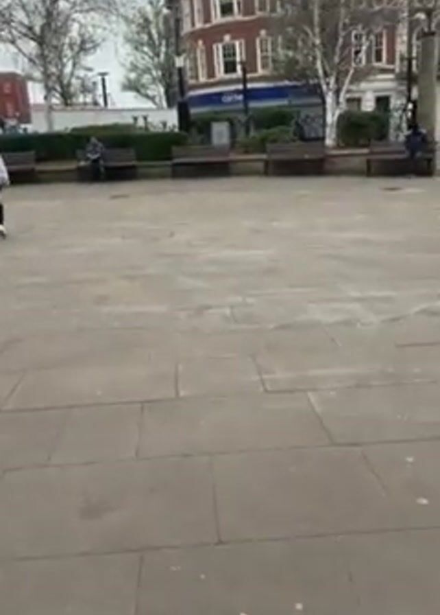town square on an overcast day. The square is paved with large rectangular stones and lined with benches. Bare trees and buildings are visible in the background, including a brick building with a "Corner" sign. A few people are walking across the square, including a woman in a white sweatshirt and black pants. There is also a cafe with tables and chairs outside. The video is shot from a low angle, giving a sense of space and perspective.