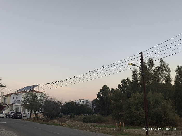 A street scene at dawn or dusk shows houses, parked cars, and trees. A utility pole stands near a wooded area. Power lines stretch across the sky, dotted with birds perched on the wires. The sky is a soft gradient of colors, suggesting either sunrise or sunset. The date and time "23/11/2025 06:30" are imprinted on the bottom right corner.