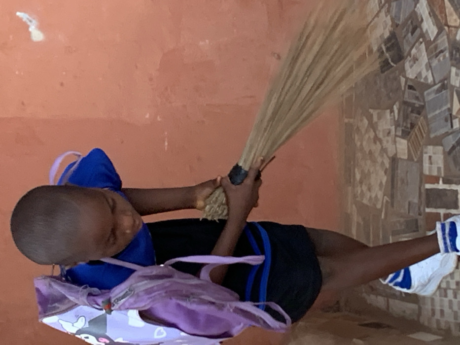 A young child wearing a blue top, dark shorts with a blue stripe, and white sneakers, carries a purple backpack. The child is holding a broom with both hands, its straw-like bristles pointing upwards and slightly to the right. The background includes a textured orange wall on the left and a wall with tilework or decorative patterns on the right. The image is captured from a medium distance.