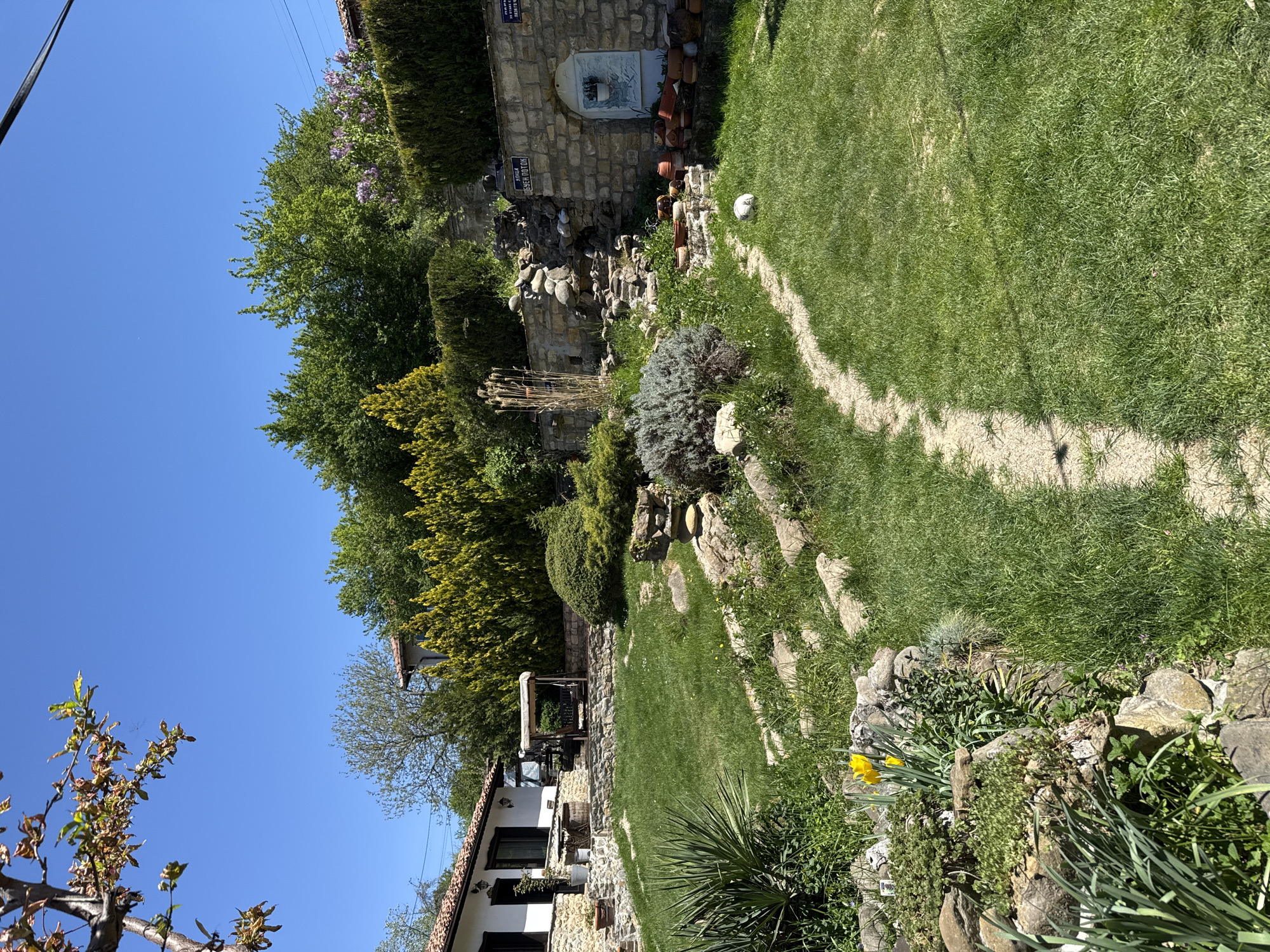 The image depicts a lush garden landscape in Malki Chiflik, Bulgaria. The scene is characterized by a well-maintained lawn intersected by a light-colored, possibly gravel or sandy path. Stone elements are prominent, including a stone building with a water feature and various rock formations integrated into the garden design. A soccer ball rests on the grass near the path. Various plants and trees, including evergreens and flowering species, create a dense and varied green backdrop. A house with a white facade and a red-tiled roof is visible in the lower part of the image, with a covered swing set in front of it. The sky is clear and blue.