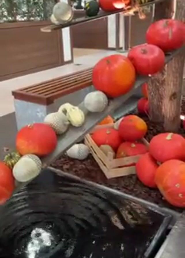 The camera provides a stable shot of an indoor decorative fountain arrangement. A square black basin holds shimmering water with a central fountain jet creating concentric ripples. The fountain sits among decorative elements including an angled ramp made of light gray wood, adorned with various types of pumpkins and gourds. Many pumpkins are round, with bright red-orange hues, while others are spherical and covered in a white mesh material. Some pumpkins are arranged in a small wooden crate. The ramp ascends to the right, supported by a simulated tree trunk and displaying pumpkins of varying sizes and colors. In the background, an indoor bench and glimpses of a shopping mall environment are visible.