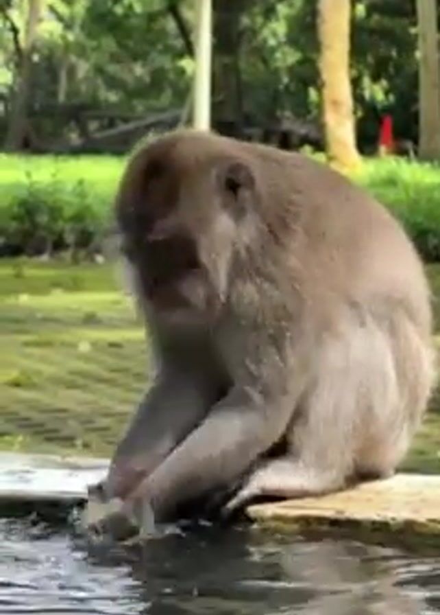 A light-brown monkey sits beside a body of water in a lush, green environment. The monkey is crouched down, using both hands to dip green leaves and debris into the water. The water is dark and reflective. The background shows trees, grass, and a stone walkway. The light is bright and diffused, casting soft shadows.