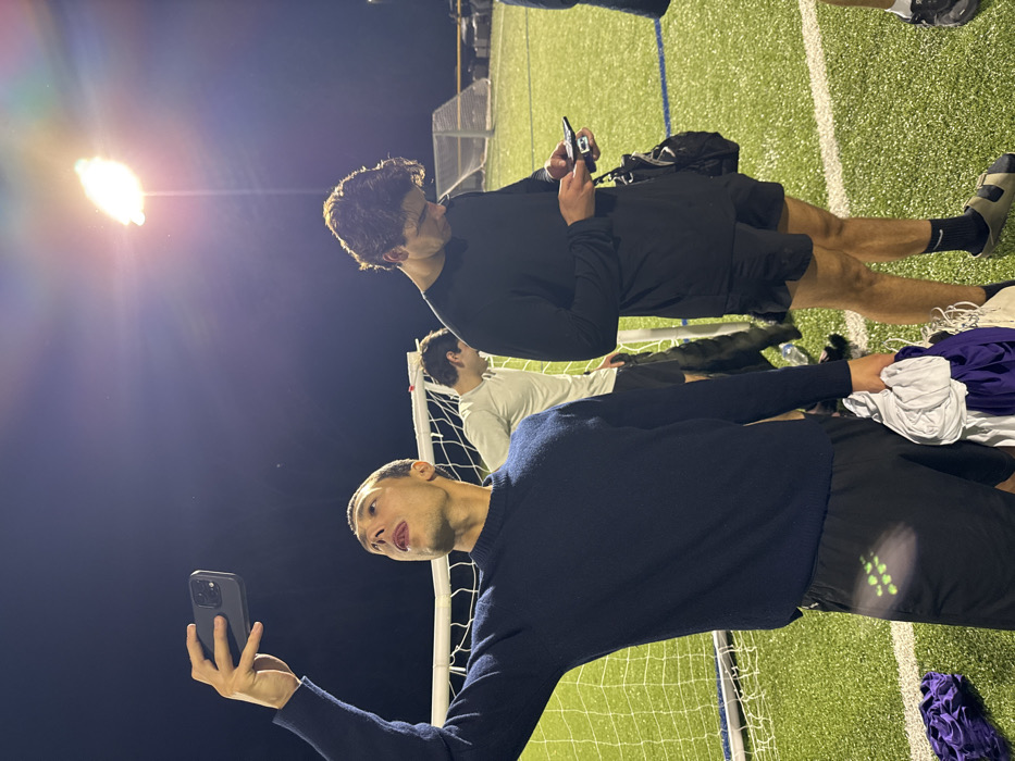The image depicts three males on an outdoor artificial turf sports field at night, illuminated by stadium floodlights, in Newton, United States. The exact facility within Newton is not discernible. In the foreground left, a male in a navy blue long-sleeved sweater and black athletic shorts holds a dark-cased smartphone aloft with his right hand, pointing it towards himself and slightly upward, as if taking a selfie or video. His tongue is partially extended. He holds a bundle of white and purple fabric in his left hand. To his right, another male in a black long-sleeved shirt, black athletic shorts, dark socks, and light-colored slide sandals stands looking down at a smartphone held in both hands. A black bag hangs from his left shoulder. In the background, partially obscured by the foreground figures, a third male in a light-colored long-sleeved shirt and dark shorts stands near a white-framed soccer goal net. A bright stadium floodlight is visible in the upper right quadrant of the image. The field features white demarcation lines.