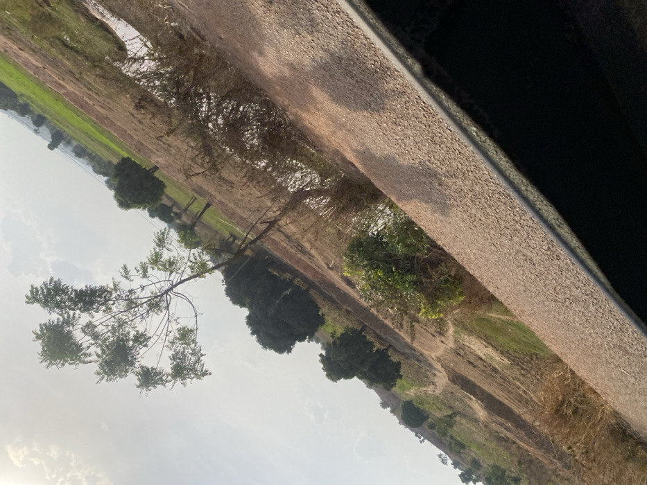 A rural landscape is captured at an angle, featuring a dirt road or path lined with vegetation. Trees and shrubs dot the scene, interspersed with grassy fields. A prominent tree with sparse foliage extends toward the sky. The perspective shifts, revealing a textured surface, possibly a road or wall, bordering a dark, undefined area. Overcast skies provide muted lighting across the vista.