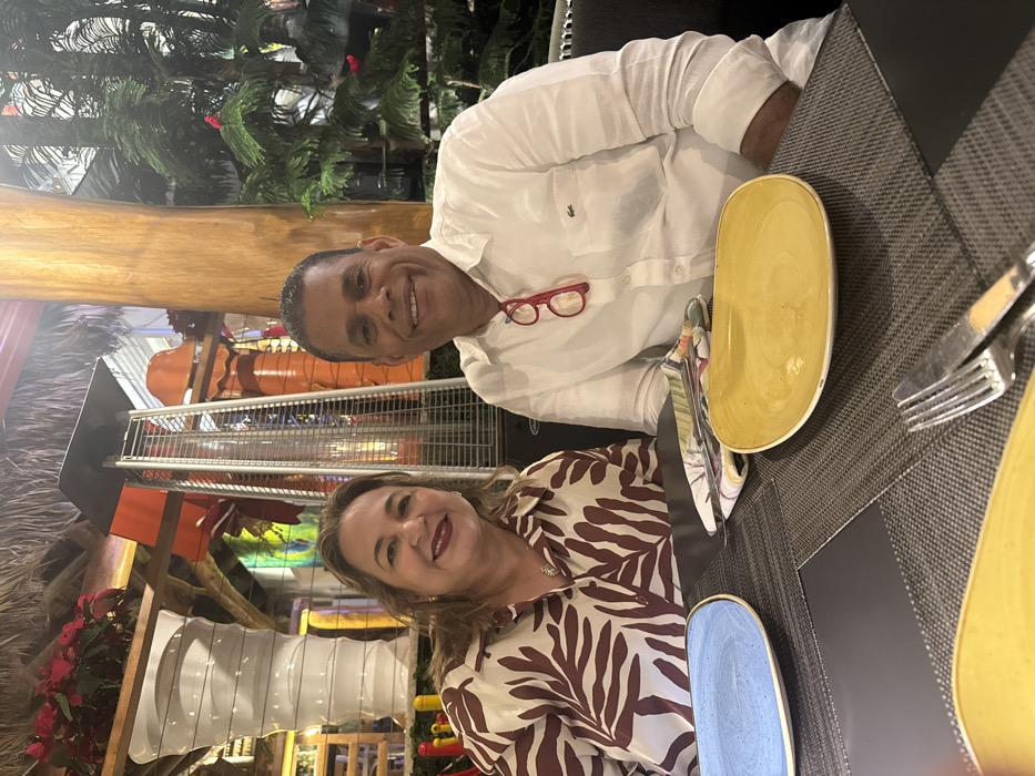 A man and a woman are sitting at a table in a restaurant. The man is wearing a white shirt and has red glasses hanging from the button. The woman is wearing a patterned shirt. The table is set with plates, silverware, and napkins. There is some sort of structure behind them with holiday decorations, some metal, some wood, and some plants.