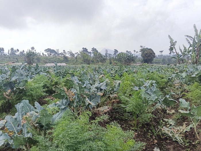 A wide-angle, static ground-level shot depicts an extensive agricultural field located within the city of Ho Chi Minh City, Vietnam, under an overcast sky. The foreground and midground are dominated by rows of cultivated green plants. Large-leafed brassica-type vegetables, possibly cabbage or broccoli, are prominent, some exhibiting signs of wear or damage on their leaves. Interspersed among these are plants with finer, feathery green foliage, consistent with carrot tops. The dark brown soil is visible between the plants. In the distant background, rolling hills or low mountains rise, densely covered with varied green trees, including some appearing to be banana plants and tall, slender species. Scattered sparsely on the hillsides are a few small, light-colored structures, likely farm buildings or dwellings. No individuals, animals, or active human interactions are visible within the frame. The scene is static, devoid of discernible action.