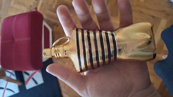 An indoor scene depicts a person's left hand holding a gold-colored, stylized male torso-shaped perfume bottle