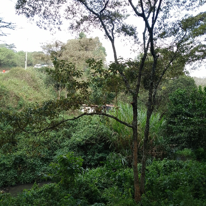 This image depicts a densely vegetated, hilly landscape in Nairobi, Kenya, under an overcast sky. In the foreground, a prominent tree with multiple dark trunks and branches partially obscures the view. Below, a narrow, dark body of water, consistent with a stream or small river, is visible on the lower left, surrounded by lush green foliage. The midground features thick, varied green vegetation, including tall, reedy plants on the right. Nestled within the midground vegetation on a slope, a small, light-colored structure with a dark roof is partially visible. In the background, a steep, vegetated hillside rises, traversed by a winding road. Several light-colored vehicles, appearing to be vans or cars, are present on this road. A single individual, discernible by an orange garment, stands or walks on the left side of the road near the vehicles.