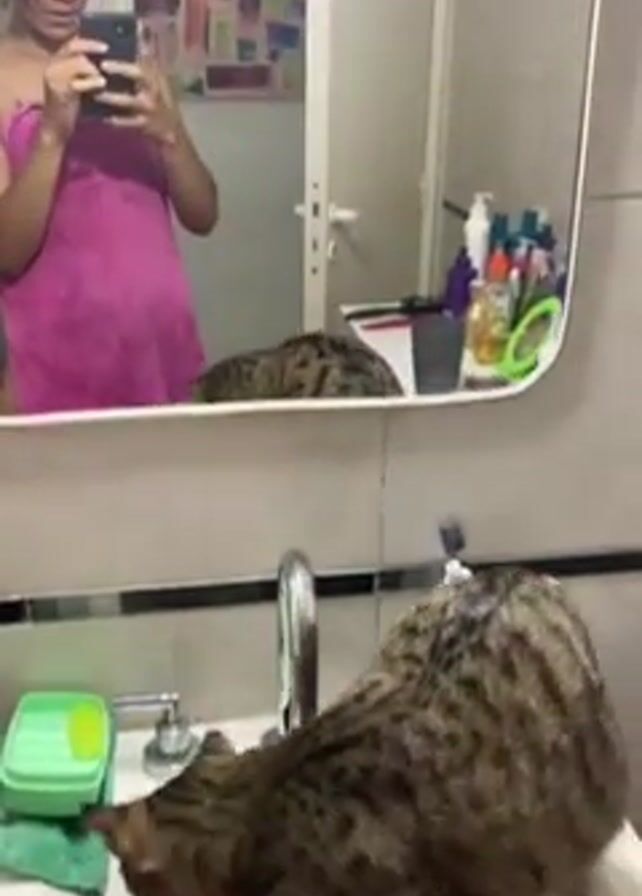 person taking a selfie in a bathroom mirror. The person, who has dark hair and is wearing a pink towel, is holding a phone up to take the picture. In front of the mirror, there is a sink where a tabby cat is standing. The cat is mostly facing away from the camera, exploring the sink with its head down and its tail slightly raised. A soap dish and a small towel are on the left side of the sink, while toothbrushes in a glass are on the right. There is a faucet in the middle of the sink. In the reflection, a shelf with various toiletries and a door in the background are visible. The scene is lit with artificial light.