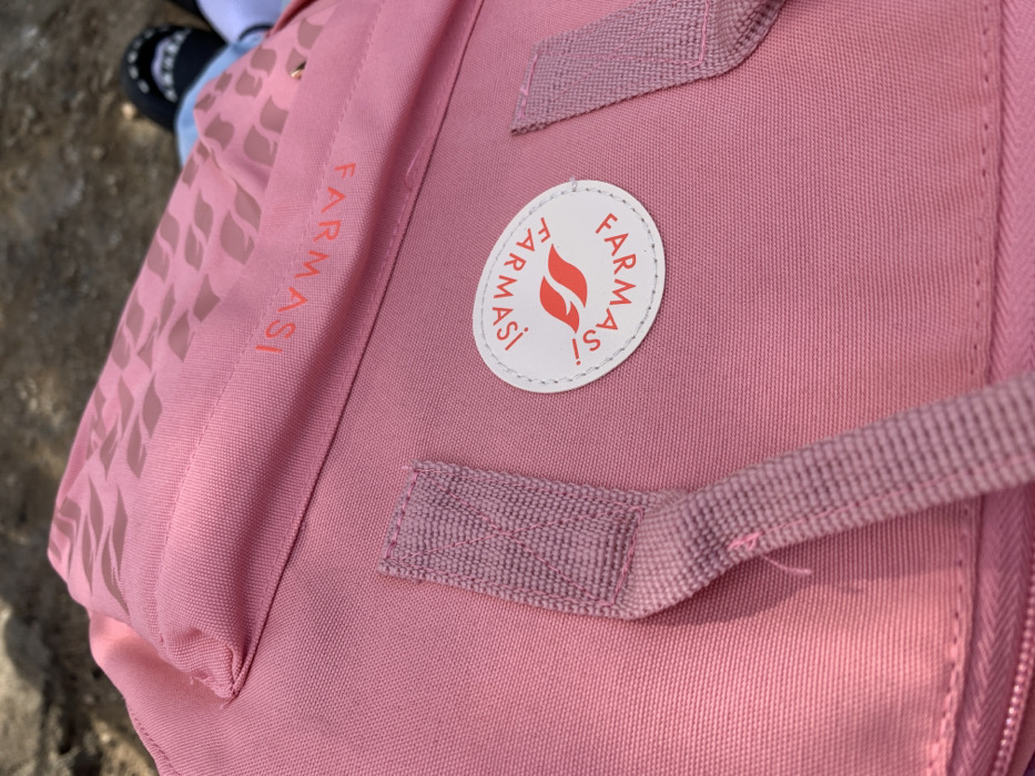 A close-up captures a pink backpack featuring the brand "Farmasi