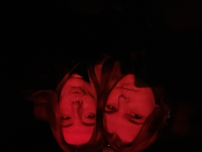 two faces, likely of the same person due to their similarity, rendered in a strong red light against a stark black background. The faces are positioned in the lower half of the frame, with the upper portion dominated by darkness. The angle suggests the photo might be upside down or taken from below. The red lighting obscures detail, creating a dramatic and somewhat unsettling effect. The duplication creates a mirrored or echoing sensation.