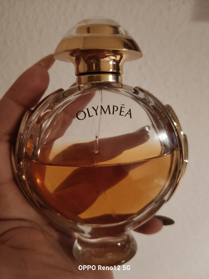 A human hand is holding a partially filled OLYMPĒA perfume bottle against a light, textured background