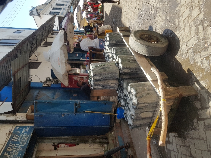 This image depicts a bustling outdoor street market scene in the Makadara/Mji Wa Kale ward, Kenya, under clear daylight. In the foreground, a robust wooden handcart with two worn rubber tires is positioned slightly left of center, laden with approximately thirty grey, rectangular plastic jerrycans, stacked three layers high and appearing dusty. A natural wood handle, secured with yellow strapping, extends from the cart towards the bottom left. The street is paved with grey interlocking bricks, showing multiple damp patches, indicating the presence of water. In the midground, to the left, a building with a blue facade features large, partially open blue metal doors. A red fire extinguisher is mounted on the wall to the left of these doors. Above the doors, a partially visible sign reads "ERS IN," followed by "BEDSHEETS, DOOR MAT, CURTAIN HOLDERS, RINGS & PILLOWS." A person's lower legs and feet, wearing sandals, are visible on a step near the blue doors. A blue bucket and a yellow pole rest against the building. Under a corrugated metal awning, a dark-skinned individual wearing a dark shirt is seated behind a market stall, tending to numerous small green bottles or containers. To their right, another vendor, wearing a white t-shirt and patterned shorts, stands with their back to the viewer, managing items on a stall beneath a large white market umbrella. Further down the street, multiple individuals are discernible amidst additional market stalls, each shaded by white umbrellas, indicating ongoing commercial activity. Buildings with white facades and traditional architecture, including one with a decorative pediment, line the street in the background under a bright blue sky. No direct personal interactions are clearly depicted.