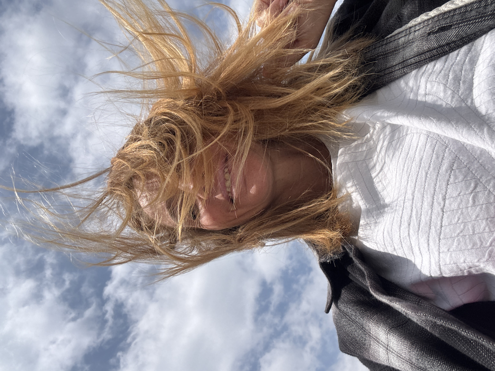 A woman with blonde hair is seen from a low angle, looking down at the camera. Her hair is disheveled and obscures part of her face. She is wearing a white shirt and a dark gray blazer. The background is a cloudy sky with patches of blue. The location is unknown.