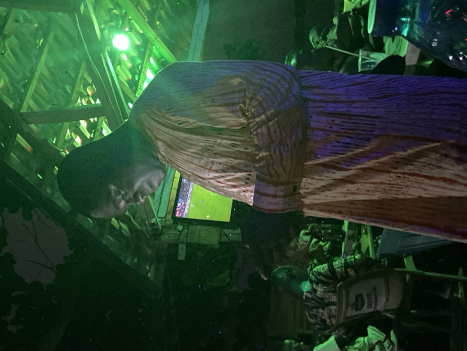 A person in dark clothing and a hat sits, watching a soccer game on a television. They wear a striped shirt, possibly a uniform. In the background, there's a drummer and other people. The room has green lighting and a rustic, possibly wooden, ceiling structure. A beer advertisement is also visible. The scene is busy and dimly lit.