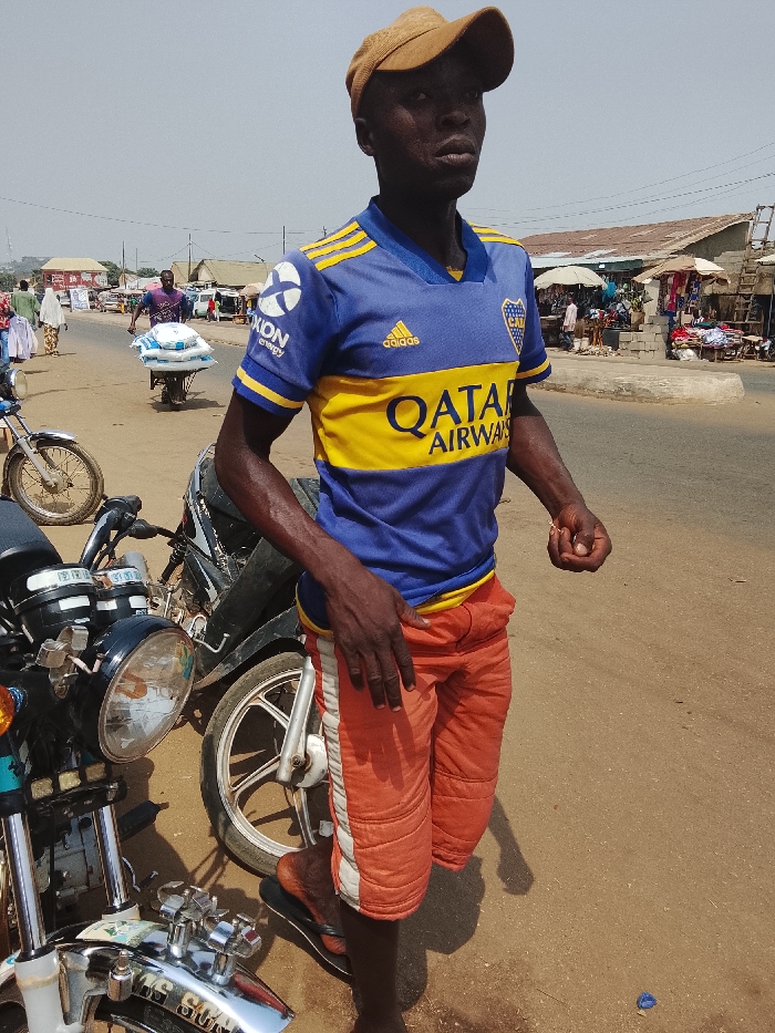 An outdoor street scene in Akwanga, Nigeria, depicts a bustling urban environment under daylight. The central figure is a dark-skinned male, standing upright, facing slightly right and upward, with a neutral expression. He wears a tan baseball cap, a blue and yellow Boca Juniors soccer jersey featuring "QATAR AIRWAYS" across the chest and "EXXON ENERGY" on the left sleeve, and orange, possibly quilted, shorts with white vertical stripes on the outer seams. Black flip-flops are on his feet. His right hand rests on his hip, and his left hand is lightly clenched. Immediately to the left of the main subject, partially visible, is the front section of a dark-colored motorcycle, showing its headlight, chrome fender, and handlebars. The word "SUN" is discernible on the headlight casing. Behind the main subject, another motorcycle's front wheel and lower frame are visible. The scene unfolds on a paved road with unpaved shoulders. In the mid-ground, a person pushes a wheelbarrow loaded with several white sacks. Other individuals are walking along the road further in the distance. To the right of the road, a market area is visible, characterized by various stalls with goods displayed, some sheltered by umbrellas or simple structures, and buildings with corrugated metal roofs. The background shows additional buildings and general street activity under a pale, slightly hazy sky.