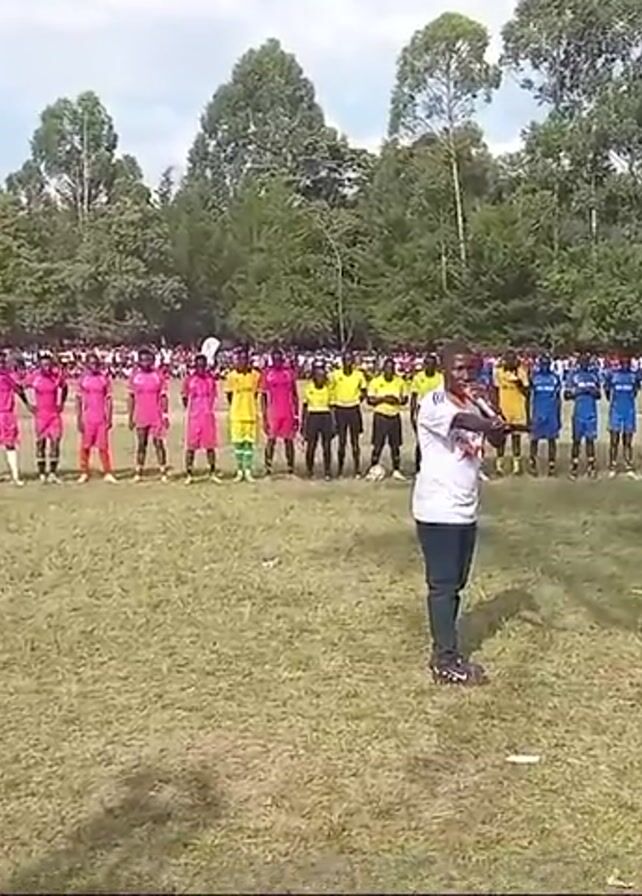 soccer field with two teams lined up, ready for a game. The team on the left wears pink uniforms, while the team on the right sports blue uniforms. Referees in yellow stand between the teams. A man in a white shirt and jeans is speaking into a microphone, presumably announcing the start of the game. A crowd of spectators lines the perimeter of the field, separated by a thick line of trees. To the right of the man with the microphone, a woman with a camera is filming the scene. The field appears to be well-used, with some patches of bare earth visible. The sky is overcast, but the overall light is good.