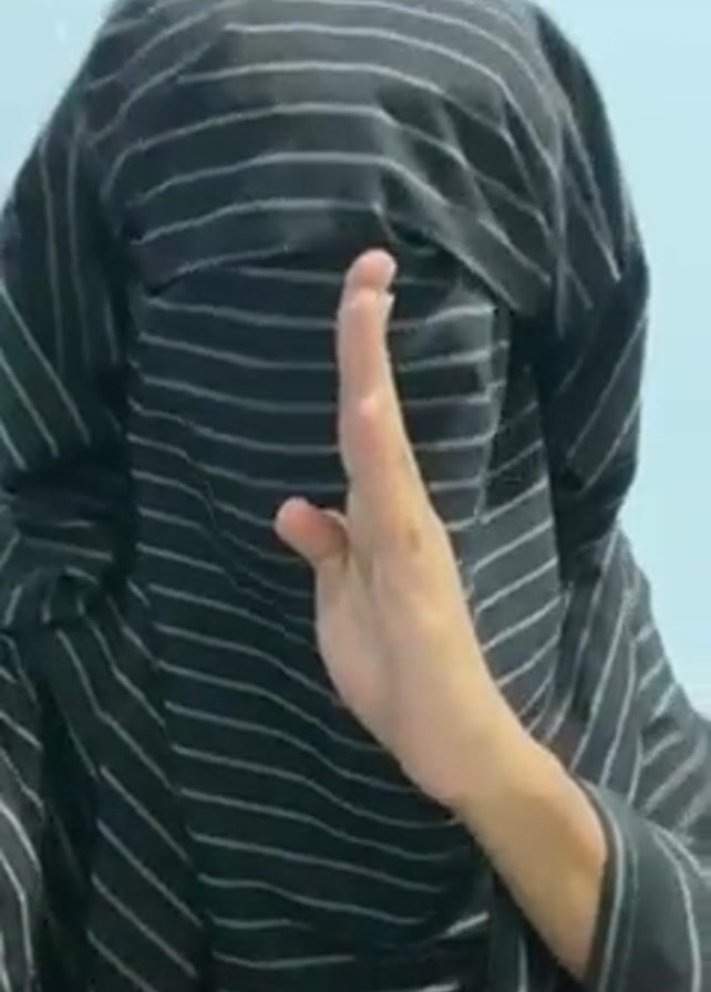 person covered in a black and white striped cloth. The person's head and body are completely covered by the cloth. One hand is raised, palm facing the camera, obscuring the face area. The background is a light blue wall.