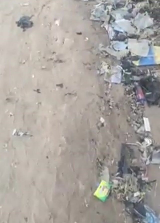 litter-strewn sandy street in what appears to be a developing country
