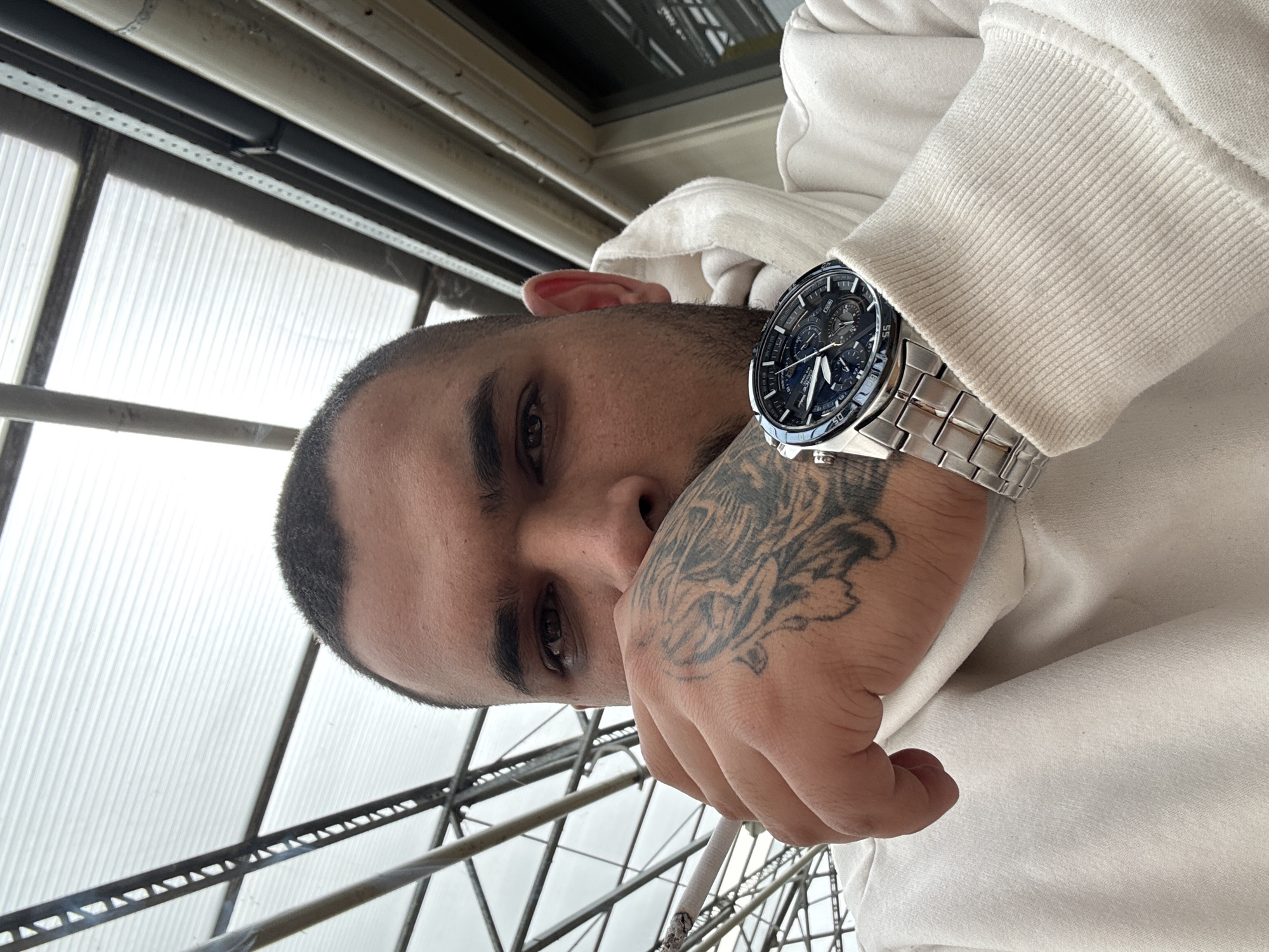 A man with short dark hair and brown eyes is facing the camera, his face slightly angled. He is wearing a white hooded sweatshirt. A silver wristwatch is visible on his left wrist, which is positioned near his face, with a tattoo covering the back of his hand. The background is a blurred industrial setting consisting of metal beams and transparent corrugated panels. Based on the location information, the picture was taken in Delfgauw, Netherlands, in what looks like an industrial warehouse building.