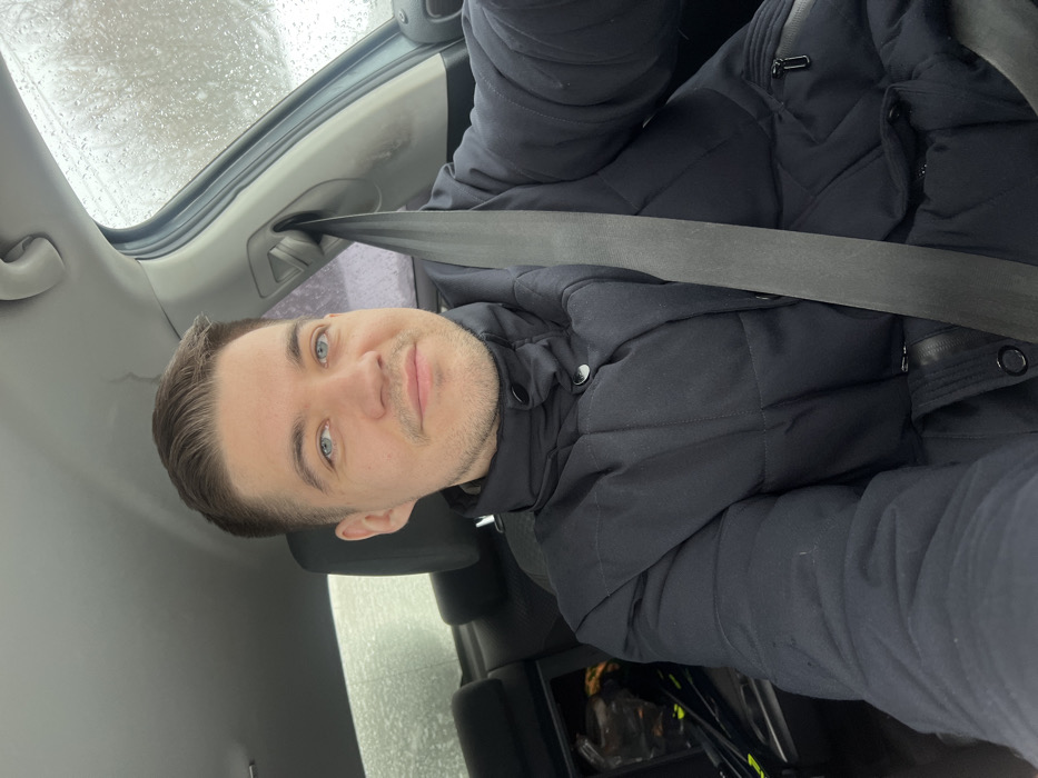 A male individual, estimated to be in his late 20s to early 40s, with short brown hair, blue eyes, and light facial stubble, is depicted in a close-up selfie from the driver's seat of a vehicle