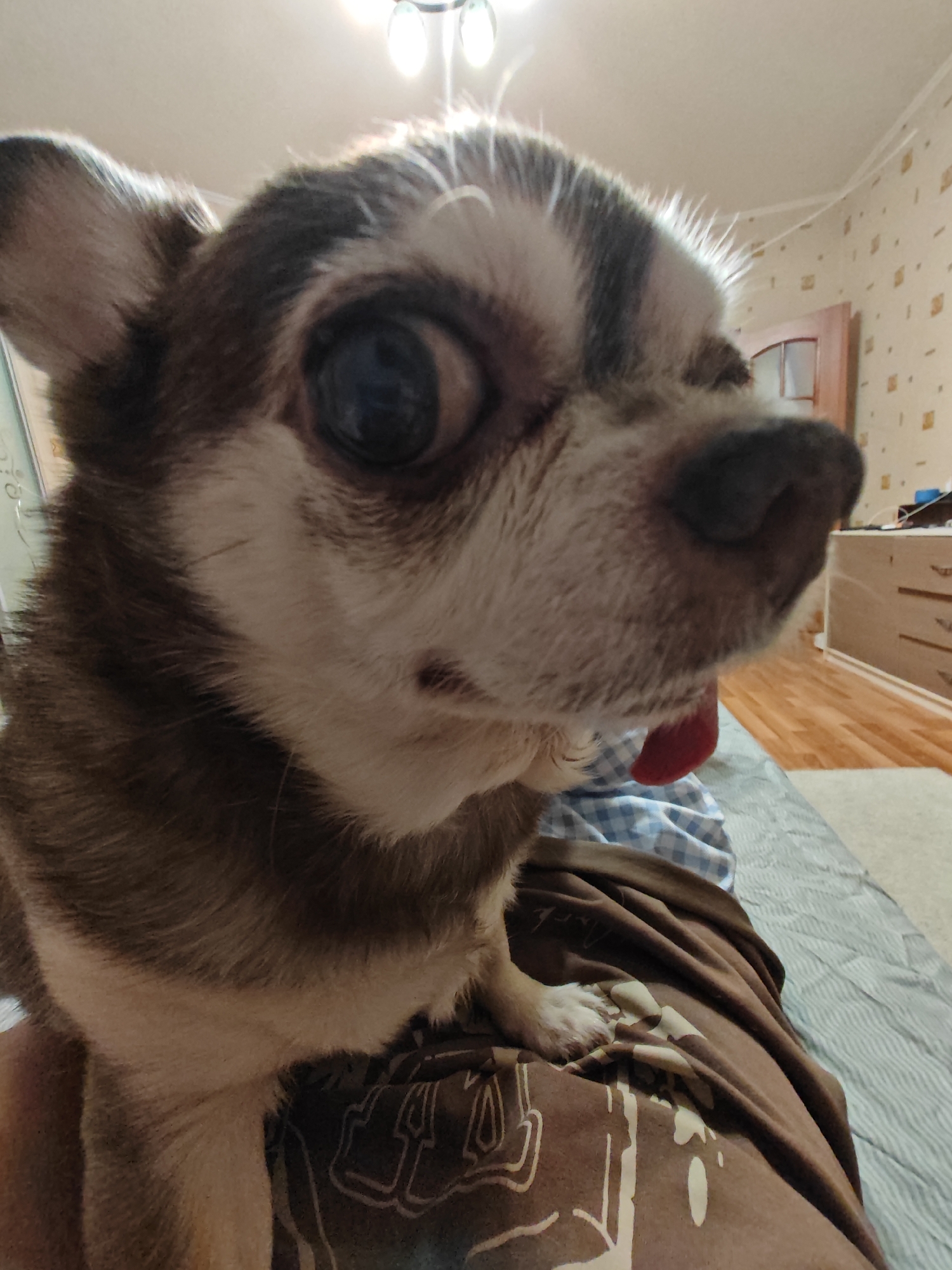 A close-up, slightly high-angle shot focuses on a Chihuahua. The dog's coat is a mix of brown and white, with the darker fur concentrated around its ears and along the top of its head. Its eyes are large and dark, with one appearing particularly prominent. The dog's nose is dark and moist, and its tongue is slightly extended. The dog appears to be resting on a person, where the clothing is brown with a light-colored pattern. The background includes a wall with a light-colored patterned wallpaper, a door frame, and a piece of furniture. The lighting is soft and diffuse. There is no evidence of any specific city visible in the image.