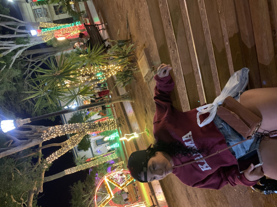 A young woman in a maroon sweatshirt and denim shorts sits sideways on a wooden bench at night. She holds a phone in her hand and wears a black baseball cap. A brown purse hangs across her body. Behind her, trees and buildings are illuminated with Christmas lights. A large, star-shaped light fixture is visible in the foreground. The scene appears to be a festive, holiday-themed park or plaza.