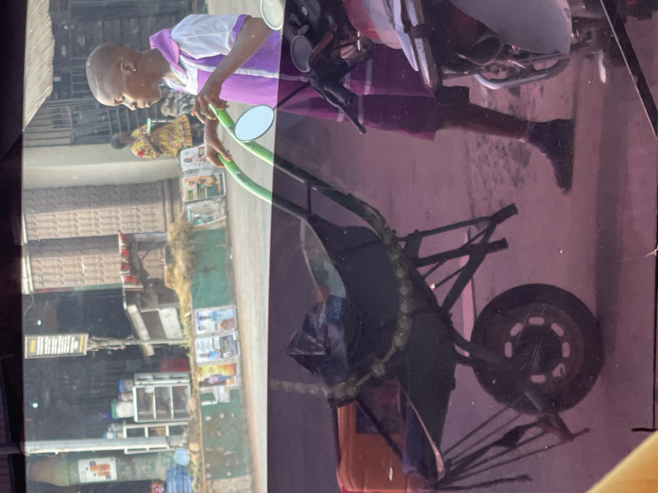 Through tinted glass, a young person in a white and purple uniform holds onto what appears to be a green mobility aid with mirrors. The aid is attached to a wheeled cart, possibly for carrying goods, which is draped with a dark cloth and what looks like a string of beads. Reflections in the glass show a street scene with shops and people.