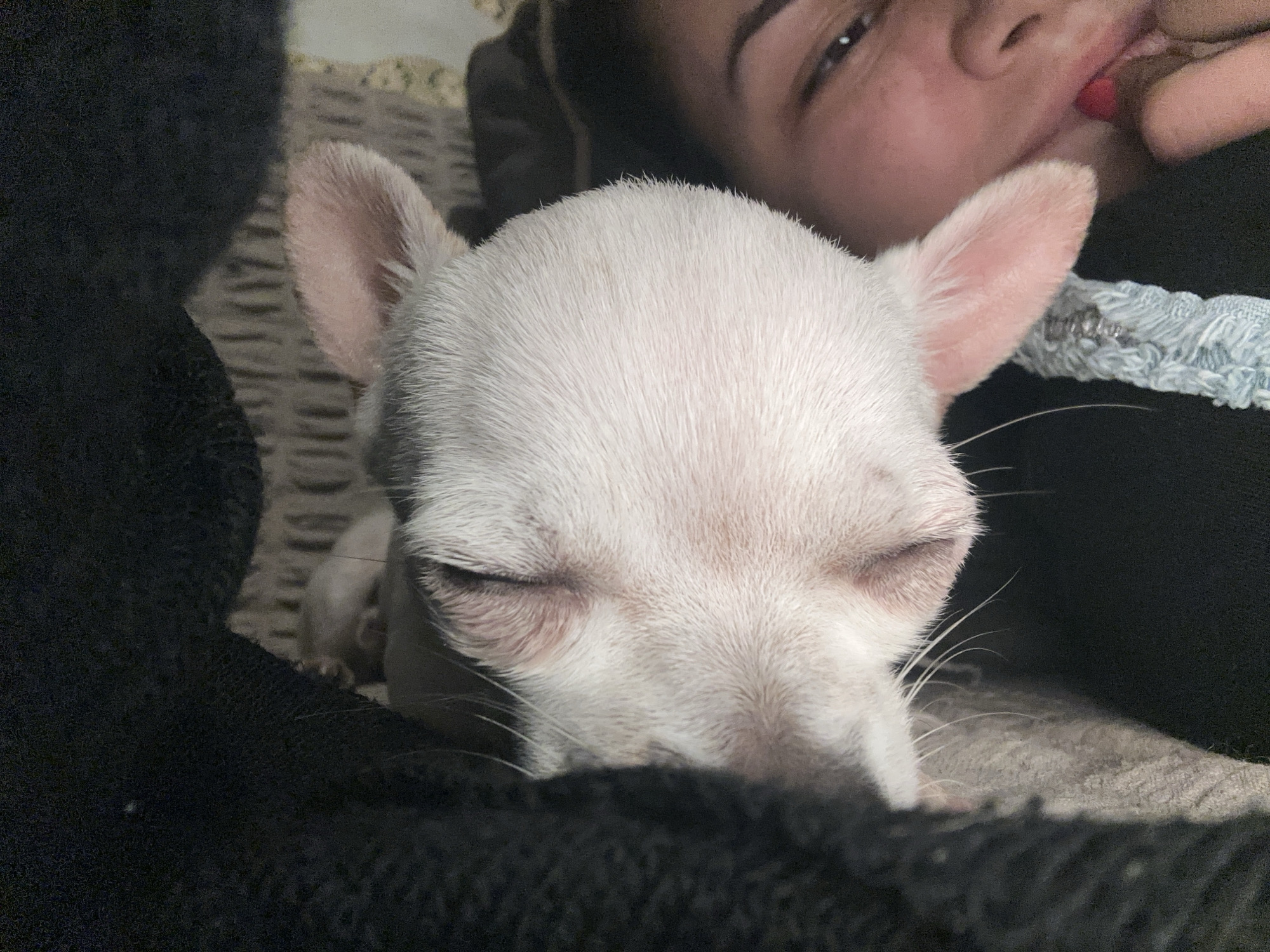 A white Chihuahua with closed eyes rests beside a person. The dog's head is centered in the frame, with its ears perked up. The person is positioned to the right and slightly above the dog, with their face partially visible. The scene appears to be indoors on a patterned surface. The background is out of focus. The location is not discernible in the image, and there is no evidence to suggest this photo was taken in Skala, Bulgaria.