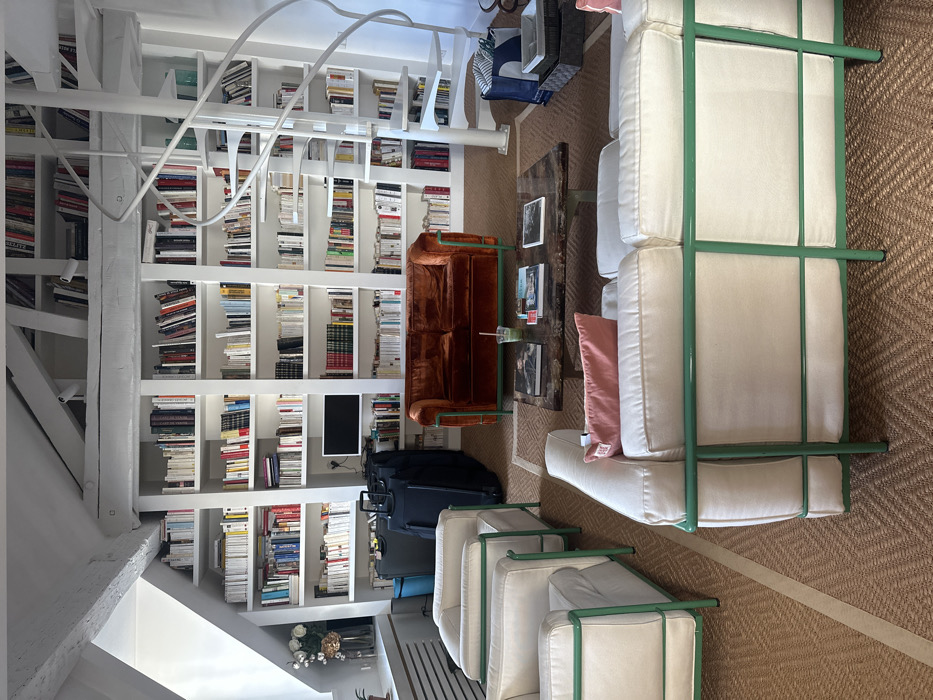 The scene depicts the interior of a brightly lit residential living space, identified as being in Paris, France. The dominant feature is a tall, white built-in bookshelf system spanning the entire rear wall and extending upwards, filled with numerous books. A black flat-screen monitor is integrated into the lower section of the bookshelves on the left. To the right, a white metal spiral staircase ascends from the main floor, partially framed by the bookshelves. The room is furnished with several seating arrangements on a light brown woven carpet. In the center, a rectangular coffee table with a raw, possibly wooden, top holds a light green cup with a straw and two books or magazines. Directly behind it is a rust-orange velvet two-seater sofa with a green metal frame. In the left foreground, two off-white upholstered armchairs with green metal frames are visible, angled towards the center. Another longer off-white upholstered sofa with a green metal frame is positioned in the immediate foreground, with a single pink throw pillow on its cushion. Near the left side of the bookshelves, two large black rolling suitcases and one smaller black bag are placed on the floor. A window on the far left reveals a windowsill holding a vase with white artificial flowers. The ceiling features exposed white wooden beams, indicating a sloped roof structure typical of an attic or loft conversion. On the far right, near the base of the spiral staircase, a blue and white striped tote bag and two stacked grey storage bins are present. No individuals are visible in the scene.