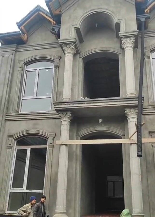 exterior of a multi-story building under construction. The building is gray with several large arched windows and columns, some of which are incomplete. There's scaffolding on the main level. Two men are standing on the steps in front of the building, one in a camouflage jacket and the other in a dark jacket and hat. The ground is littered with construction debris including pipes, cardboard, and wood. The sky above is overcast.