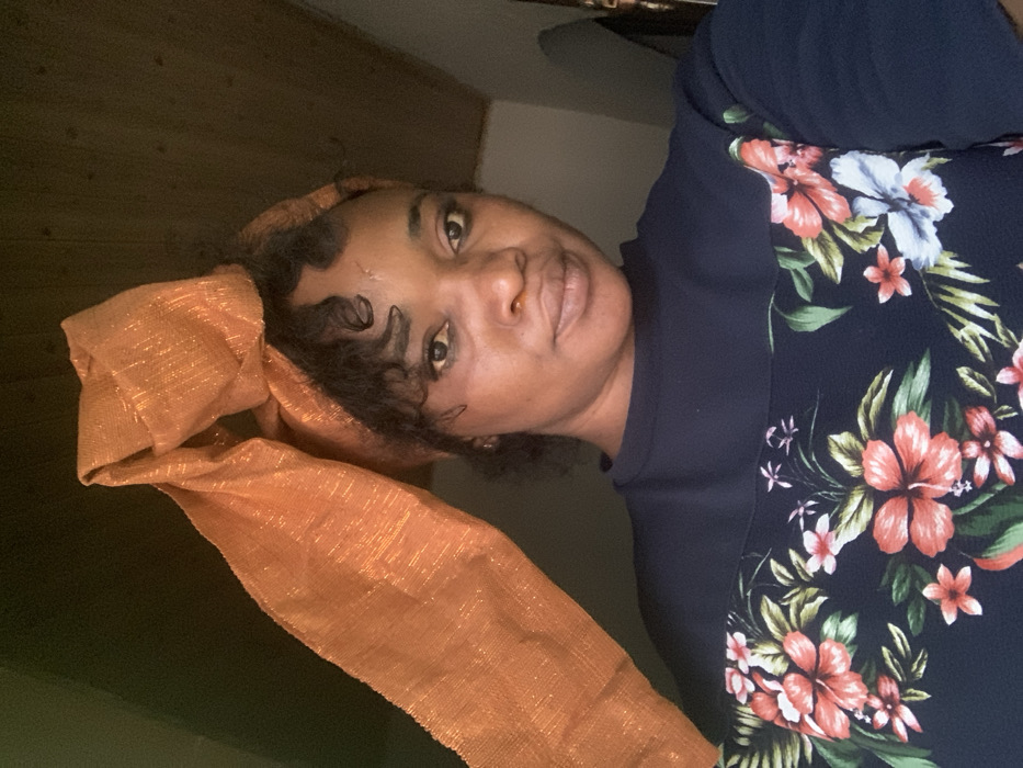 A woman with tan skin and dark curly hair is wearing an orange headscarf tied in a bow. Her face is angled toward the camera, showing her eyes and a slight smile. She is wearing a dark blue floral-print blouse. The background appears to be a dark wall. The image has a slightly rotated orientation.