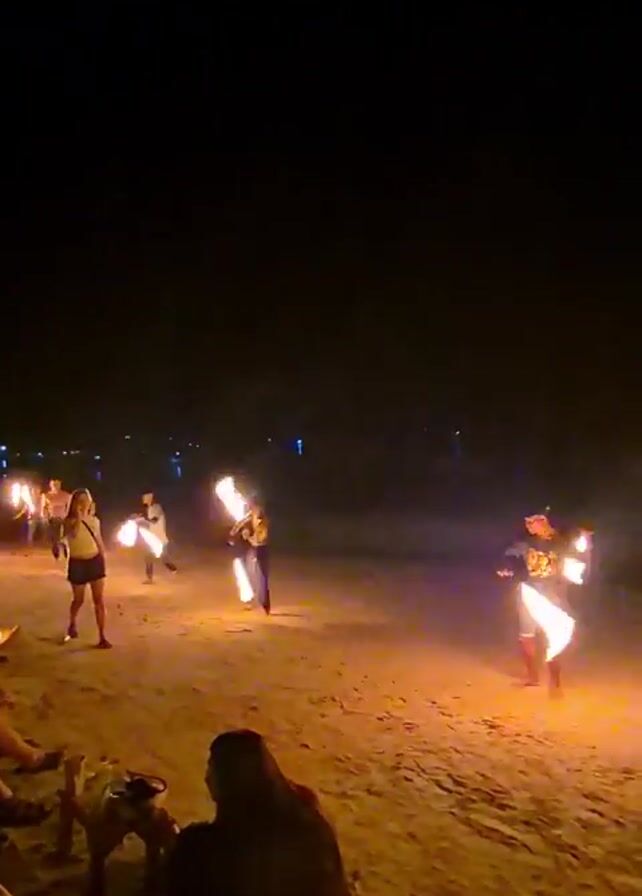 At night on a sandy beach, a group of fire dancers perform for a crowd