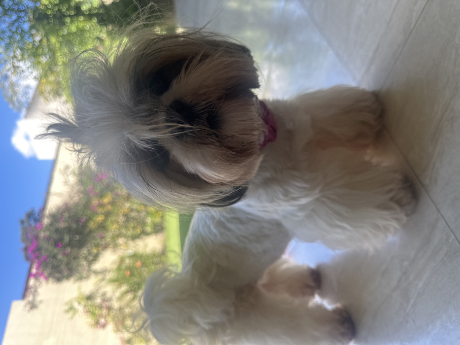 A small, fluffy, white and brown Shih Tzu-type dog stands indoors