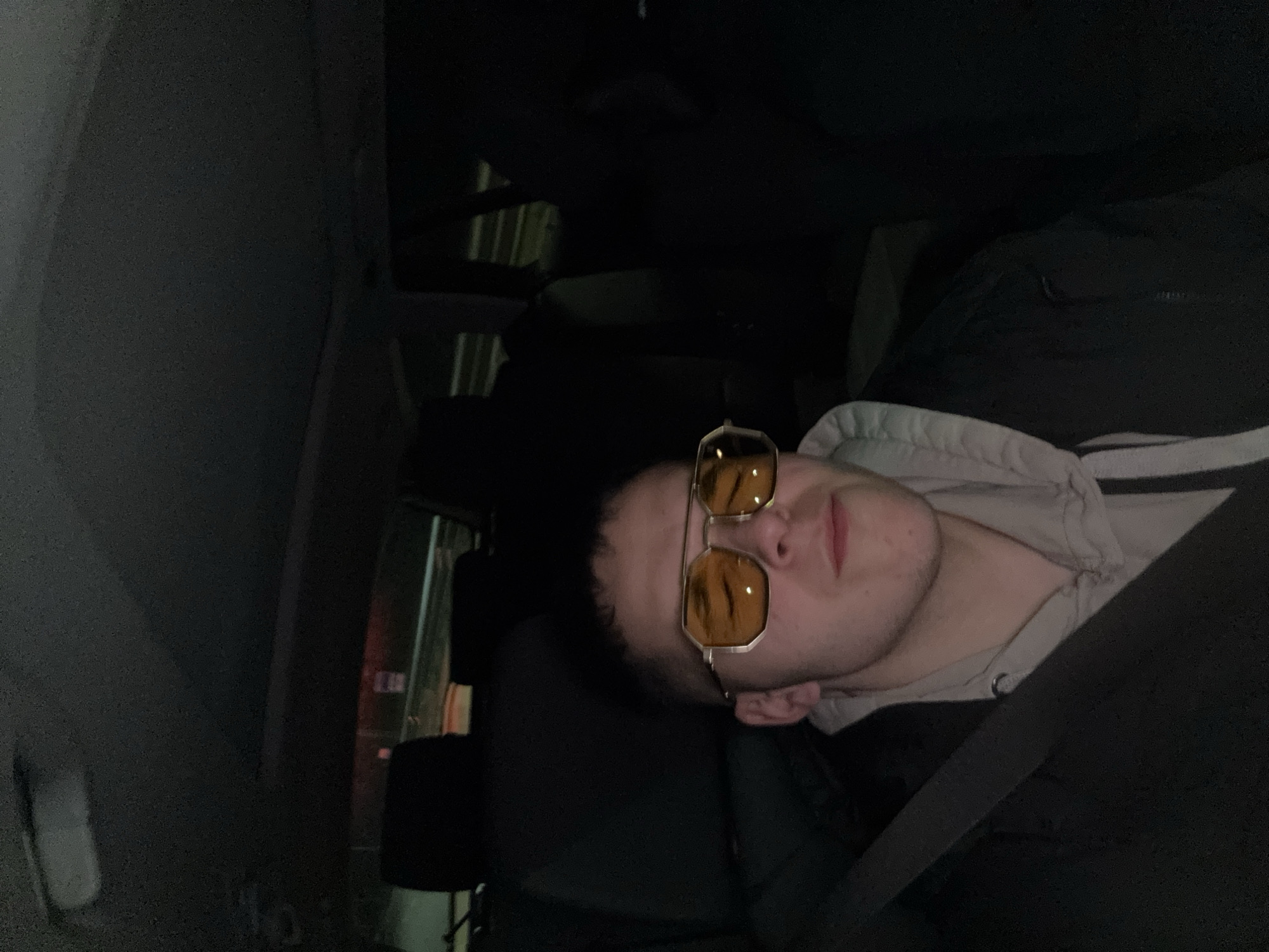 A man wearing yellow-tinted sunglasses is reclining in the passenger seat of a car