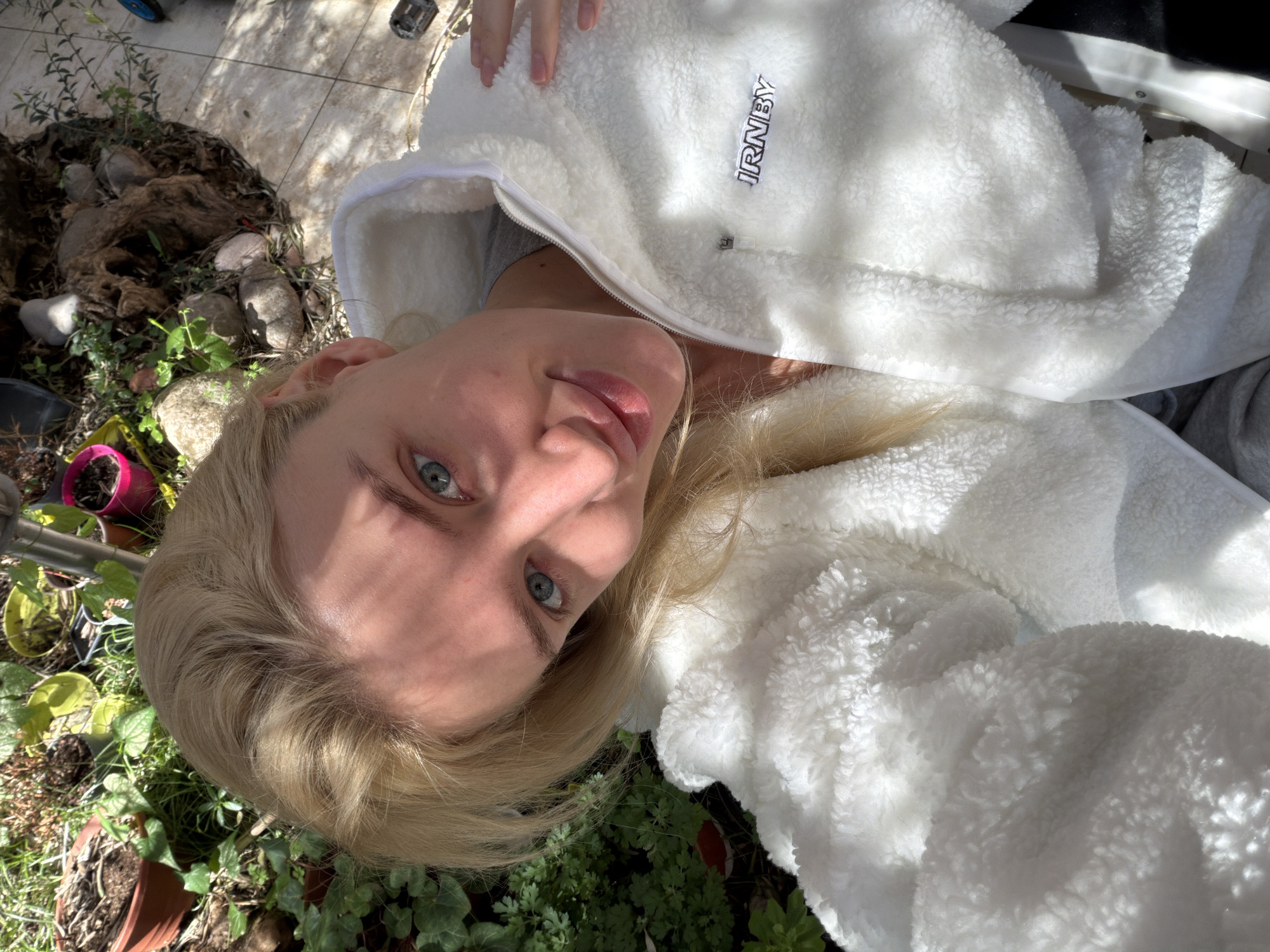 The image displays a fair-skinned female subject with blonde hair and blue eyes, smiling subtly at the camera in a selfie-style shot. She is wearing a white, fuzzy, zippered jacket with "JRNBY" embroidered in dark text on the left chest area; a grey garment is visible beneath the partially unzipped jacket. Her left hand is positioned near her left shoulder, touching the jacket. The background is an outdoor setting in the city of Nerin, Montenegro, featuring green foliage, various potted plants in terracotta and colored pots, rocks, and a piece of exposed wood or root on the left. The right side of the background shows a light-colored tiled or paved surface. The scene is lit by natural sunlight, casting shadows on the subject's face and creating highlights on her jacket.