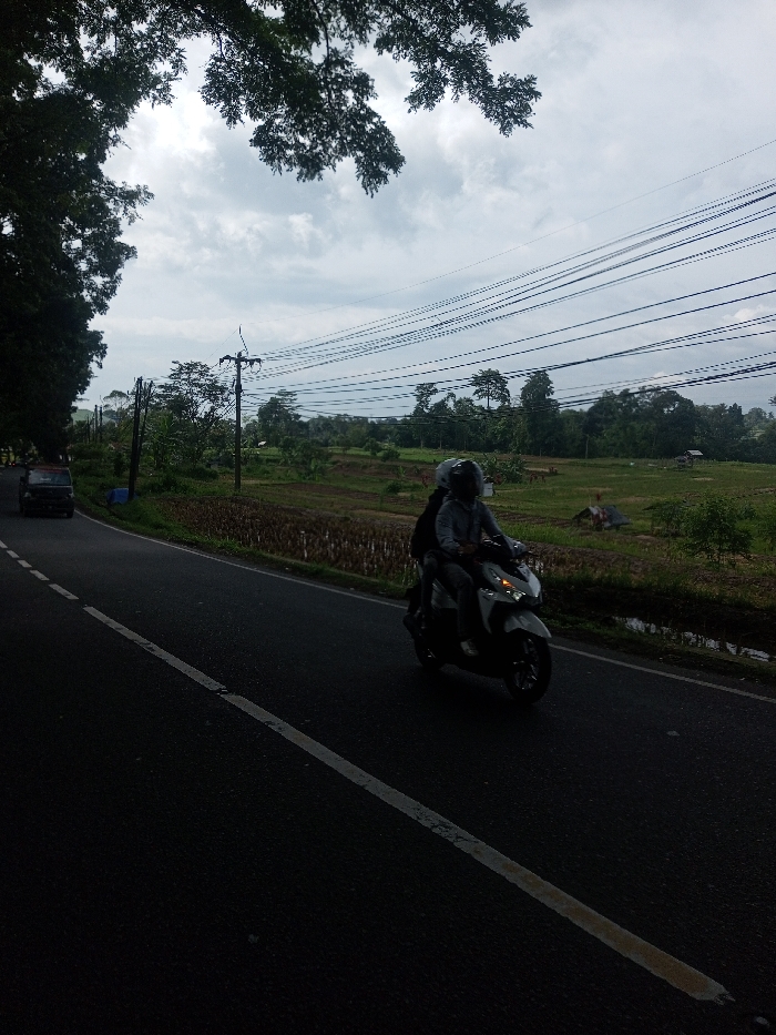 The image portrays an outdoor scene within Chhenangri_Rishor, Bhutan, under an overcast sky. A dark asphalt road, featuring a white dashed lane marking in the foreground, curves to the left. In the midground, a light-colored scooter, possibly white or light grey, travels from right to left. Two individuals occupy the scooter; the driver wears a grey top and a dark full-face helmet, while the passenger, seated behind, also wears a dark full-face helmet and a dark garment or backpack. The scooter's headlight is illuminated. Further ahead on the left side of the road, a dark-colored small truck or utility vehicle is partially visible. The left upper frame is obscured by the dark green foliage of a large tree. To the right of the road, an agricultural landscape unfolds, comprising cultivated fields, some exhibiting brown stubble and others green vegetation. A narrow dark waterway or ditch runs parallel to the road. A wooden utility pole supports multiple dark electrical or communication wires stretched across the upper midground. In the distant right, a small, elevated hut with a dark roof stands in a field, with another smaller, darker structure visible closer to the road. The background consists of dense green trees and hills beneath an overcast sky with light grey and white clouds.