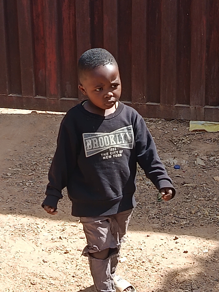 - "A young, dark-skinned child, approximately 2-4 years old, stands centered in the frame against a reddish-brown corrugated metal wall" by FM-xQ01I3, licensed under CC BY 4.0