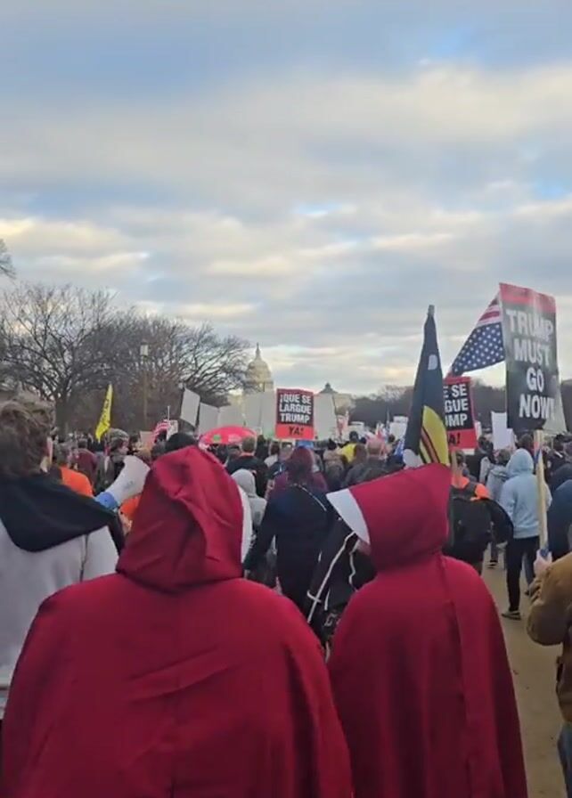 crowd of people protesting on a grassy area. Several people are holding signs with anti-Trump messages such as "Trump Must Go Now!" and "Que se largue Trump ya." Some people are dressed in red robes and white bonnets, resembling costumes from "The Handmaid's Tale." The U.S. Capitol building is visible in the background. The sky is cloudy and the trees are bare, suggesting it is either late fall or winter.