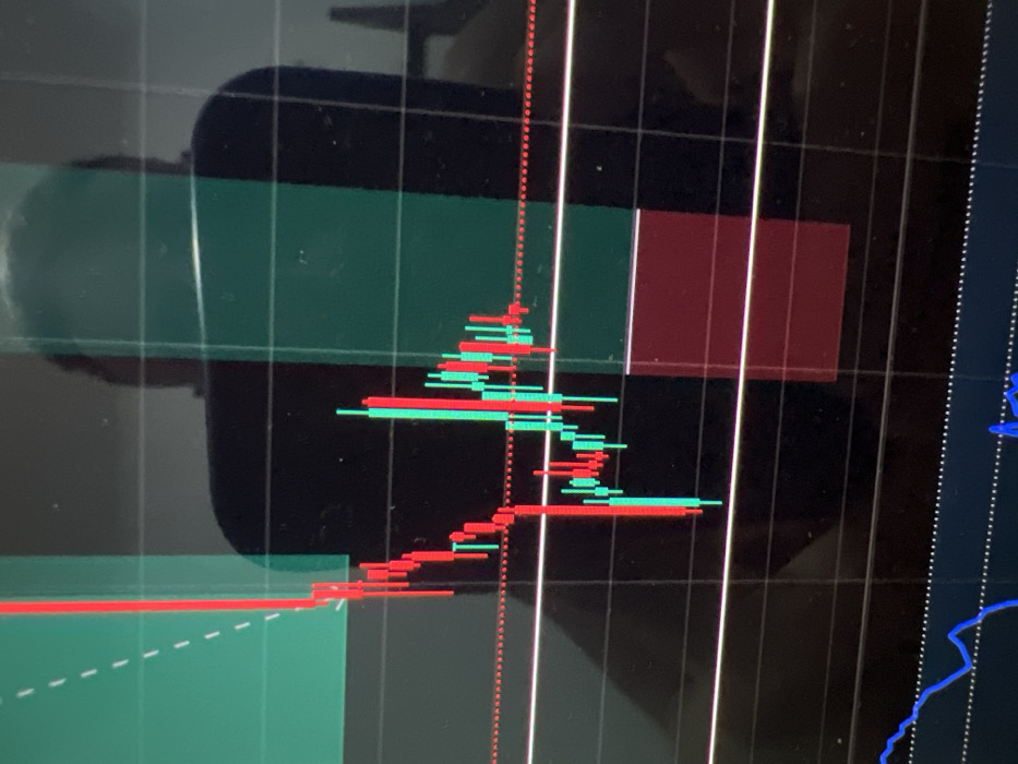 The image displays a financial chart with red and green candle sticks, likely indicating stock market data. There's a vertical dotted red line near the center of the chart. Green and red rectangular blocks highlight specific zones of the chart. A reflection is visible on the screen, causing a distortion of the image. A grid pattern underlies the chart, adding to its structured layout. A blue line is visible on the right side of the image.